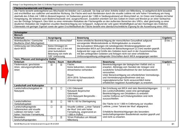 - Gemäß Abwägungsdokument des Regionalen Planungsverbandes zum Vorranggebiet (VRG) – W65 Sehboldsruhe gibt es außer dem Artennachweis Schwarzstorch keine weiteren Hinweise. Werden hier Fakten unterschlagen? Es leben Uhus, Wanderfalken und Fledermäuse in den Habitatgehölzen. Im Alten Eichenen Wald - Stadtwald Miltenberg - leben bedrohte Amphibien wie die Gelbbauchunke oder Salamanderarten in den alten Lehmgruben.